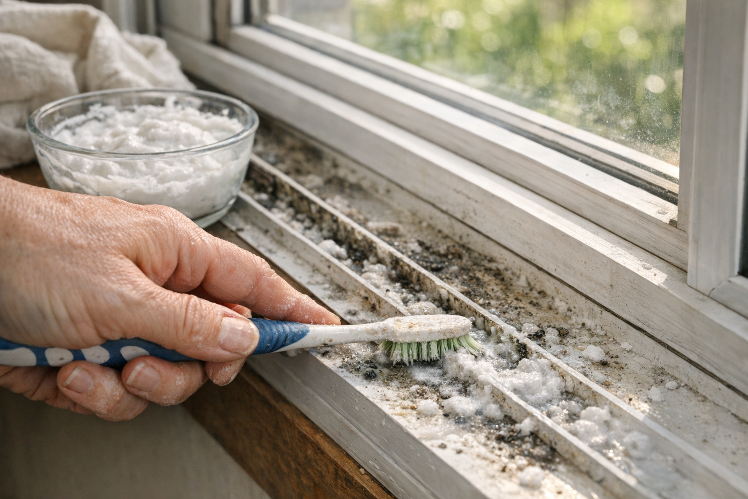 Vacuum loose debris first. Apply a paste of baking soda and a little water to moldy spots, let sit 10 minutes, then scrub with an old toothbrush. Wipe with white vinegar to kill remaining spores. For stubborn black mold, a 50/50 hydrogen peroxide and water spray finishes the job — gentler than bleach on window frames.