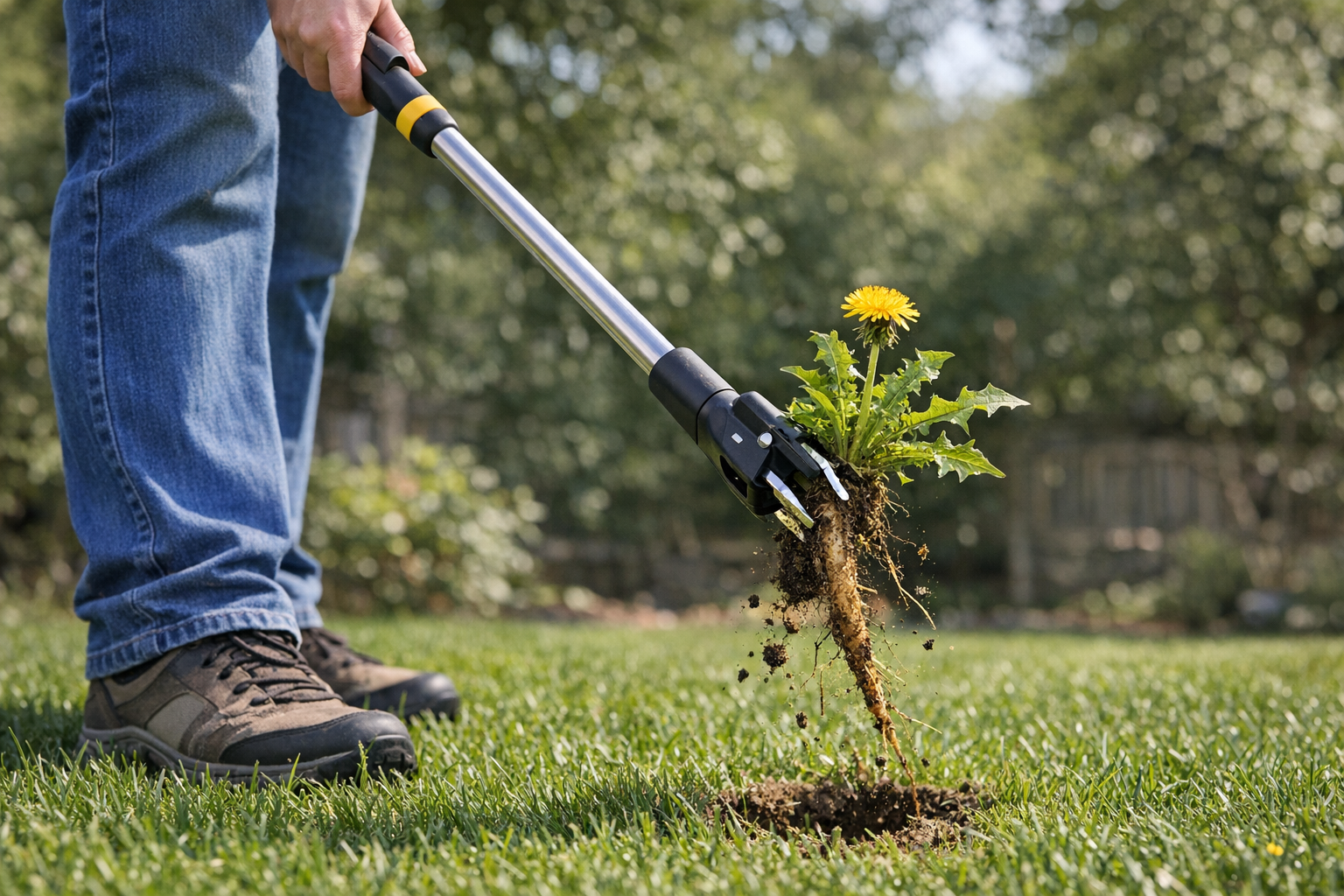 Use a long-handled dandelion weeder. The tool's claw grabs around the root, and the foot lever pops the entire plant out without bending over. A good one removes 50+ dandelions in 30 minutes.