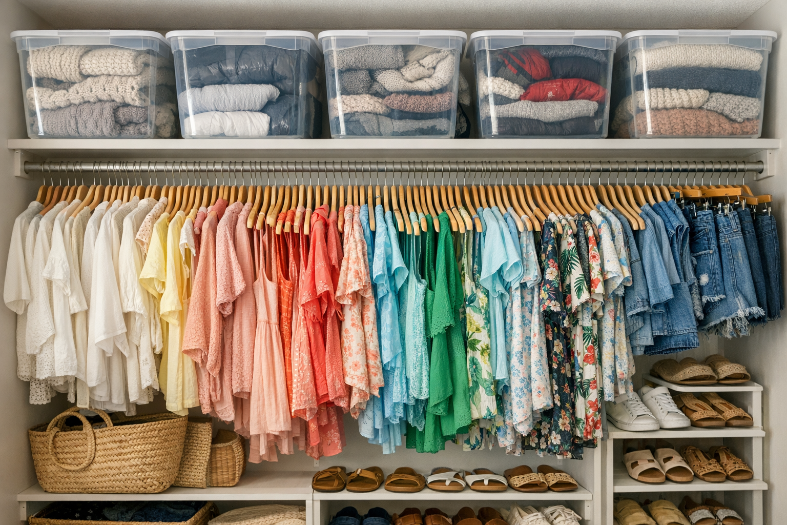 The seasonal wardrobe swap is the highest-impact closet project most people skip. 90 minutes once a year and you stop looking at sweaters in July, your morning routine speeds up dramatically, and the closet stops feeling cramped.
