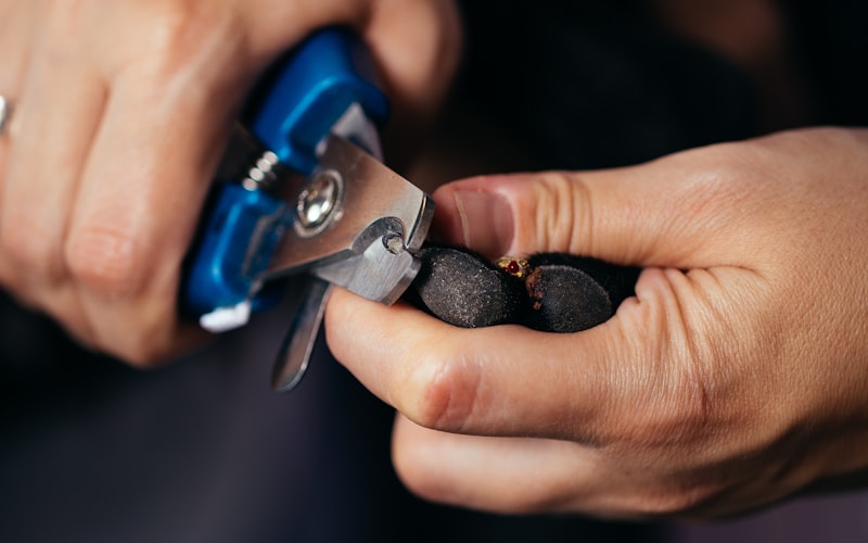 Use sharp scissor-style clippers for most dogs. Hold the paw firmly, cut at a 45-degree angle, and trim only 1-2mm at a time to avoid the quick (the blood vessel inside the nail). For dark nails, look for a dark circle in the cross-section — stop when you see it. Keep styptic powder nearby in case of bleeding, and always reward with treats.